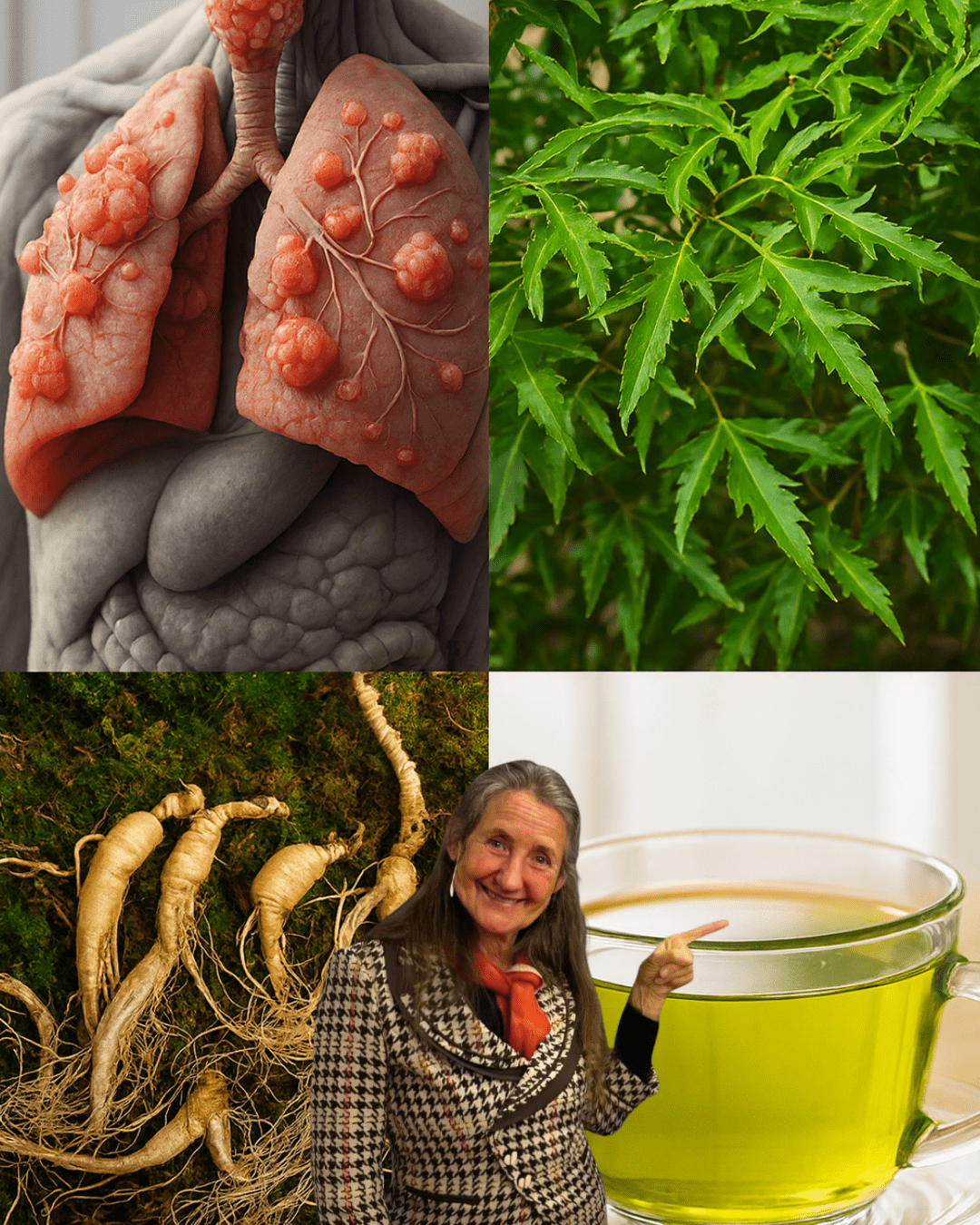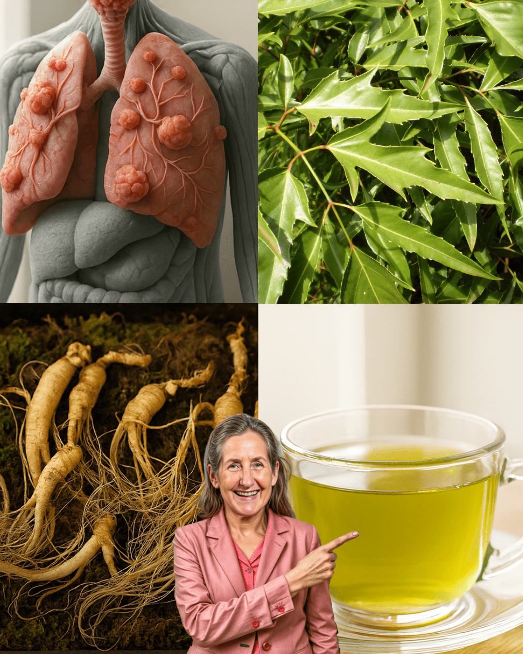 The second and third images introduce two critical conceptual components that form the core of this discussion: the representation of pulmonary health challenges (specifically, nodules or tumors on the lungs) and the visual of Ginseng roots. The fourth image depicts a cup of green, medicinal tea.