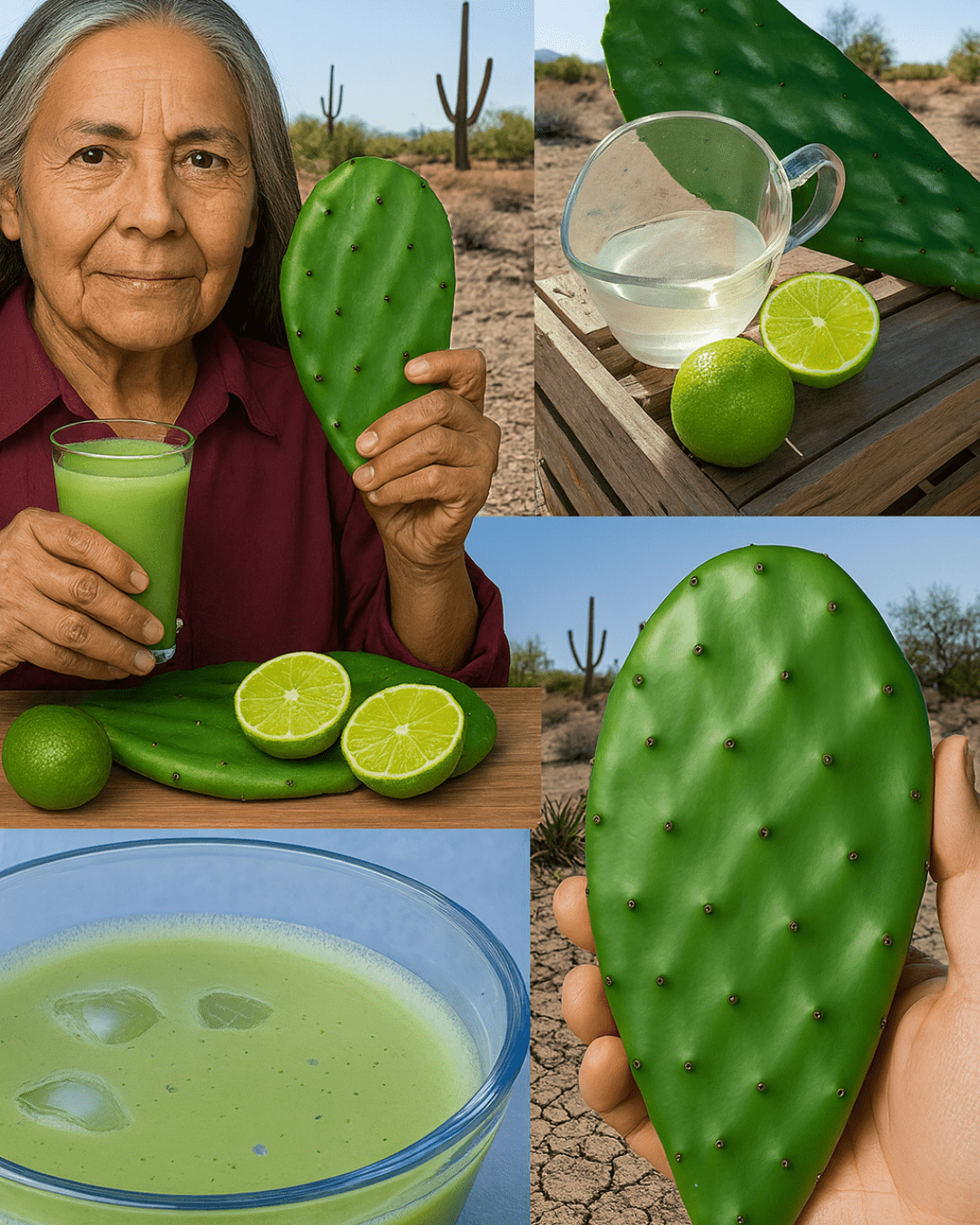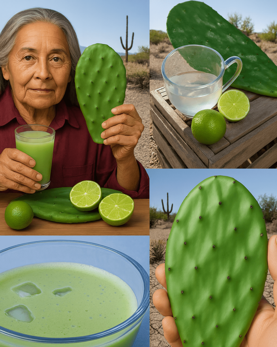 The images before you tell a compelling story rooted in traditional desert wisdom. They feature an indigenous woman, a symbol of generational knowledge, holding a glass of bright green juice and the source of its power: the Nopal Cactus Pad (also known as Prickly Pear). Flanked by fresh limes and set against the stark, challenging desert environment, this visual strongly suggests a potent, two-ingredient remedy passed down by a traditional healer, specifically targeting profound health issues like high blood sugar and systemic inflammation.
