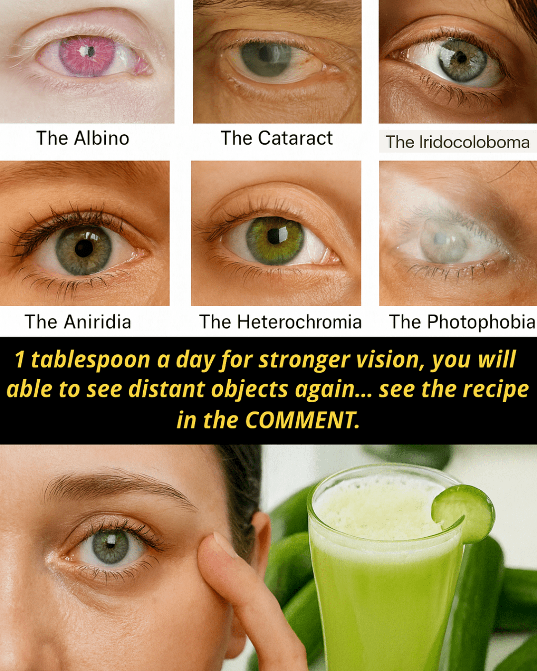 Imagine waking up every morning and feeling like there is a permanent fog lifting from your eyes, allowing you to see the world with a sharpness you thought was lost forever. For millions of people, the gradual decline of vision is a terrifying reality. We live in an era where our eyes are under constant siege. From the moment we wake up to the second we sleep, we are bombarded by blue light from screens, environmental pollutants, and the natural wear and tear of aging. The image of various eye conditions—from the clouding of cataracts to the sensitivity of photophobia—serves as a stark reminder of how fragile our sight truly is. However, nature has provided us with potent tools to fight back, and sometimes the most effective solutions are hidden in the simplest ingredients found in our own kitchens. There is a specific green preparation, a simple juice, that many are calling a miracle for the eyes, claiming that just a small daily dose can help restore clarity and focus.