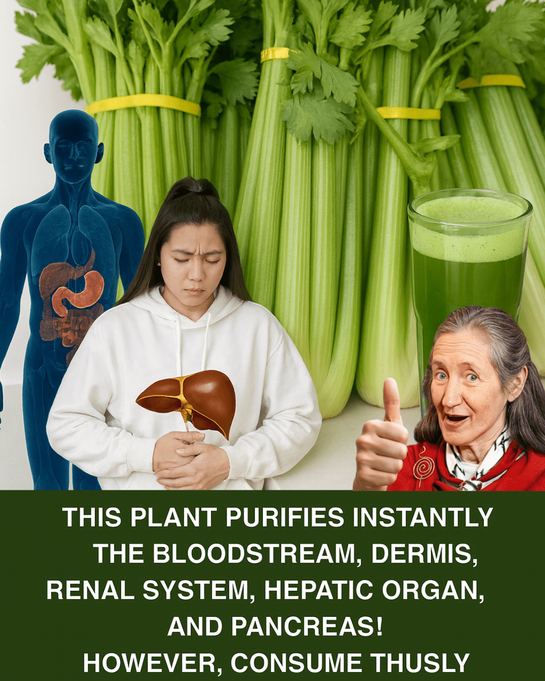The image before you, featuring the iconic bunches of Celery and a woman struggling with organ distress, alongside a glass of potent green juice, is a direct, undeniable clue to the solution. This is not about adding another minor dietary modification; this is about deploying a surgical-grade botanical agent that targets the very core of your body’s purification mechanism. This plant promises, and delivers, a cleansing effect so powerful it is said to purify the bloodstream, regenerate the skin, and thoroughly cleanse the renal system (kidneys), hepatic organ (liver), and the vital pancreas—all in a remarkably short period. But here is the critical part, the secret that separates those who achieve true, lasting cleansing from those who simply drink a mediocre, ineffective green juice: it only works if you use it in one specific way. If you are ready to bypass the guesswork and unlock the true, transformative potential of this “forbidden green elixir,” then prepare to discover the precise method that empowers this ordinary plant to perform extraordinary feats of internal restoration. Your journey toward instant, systemic purification begins now.