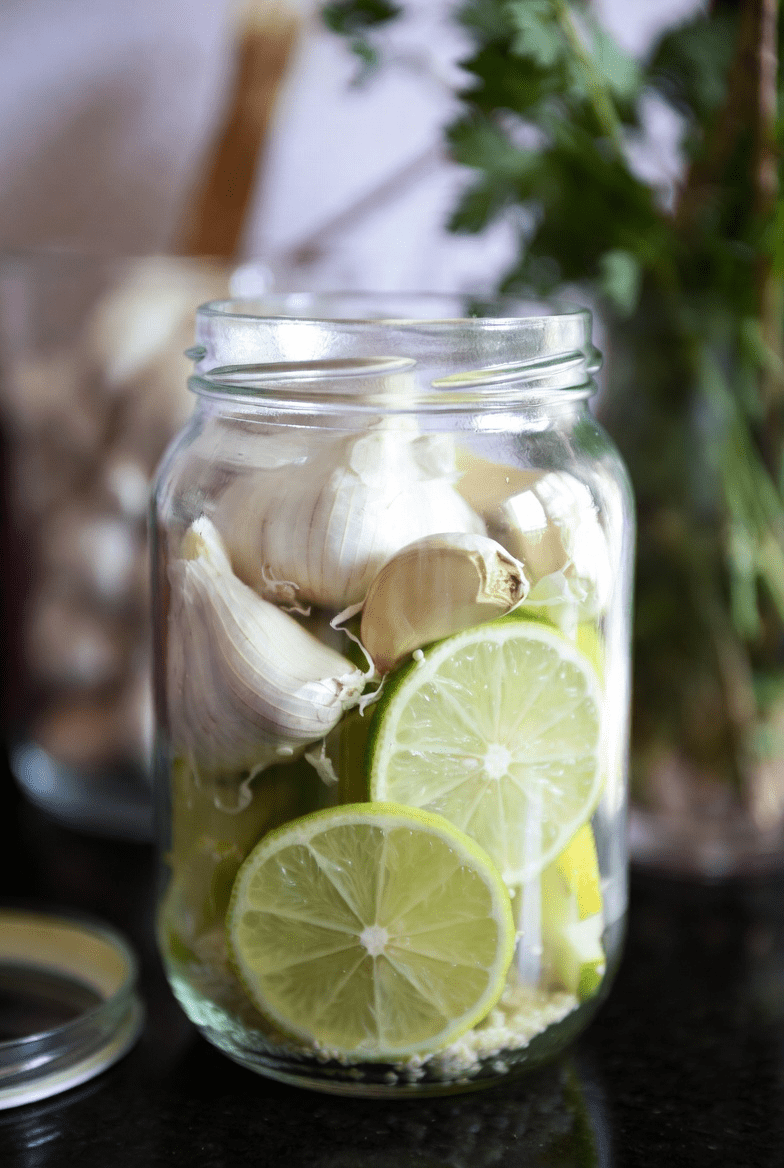 - Place the crushed garlic and lime slices alternately in layers inside the clean glass jar.