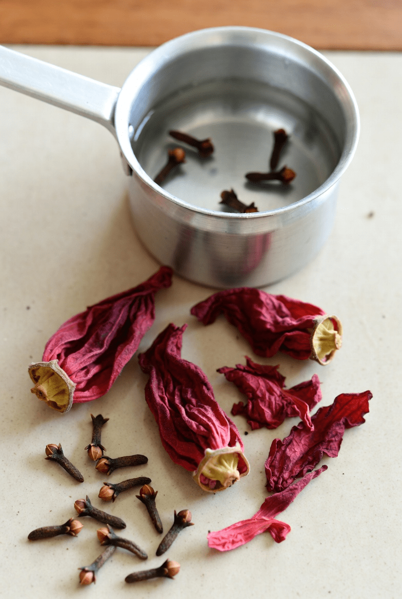 - Gather ingredients: 1 tablespoon dried hibiscus calyces, 4-5 whole cloves, 2 cups water, optional honey for sweetness.