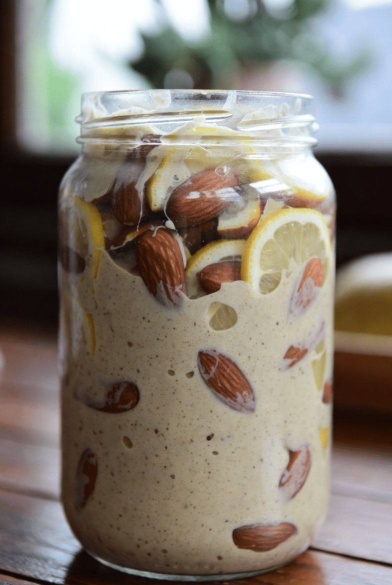 - In a clean glass jar, combine the soaked almonds, lemon zest, and lemon juice. For extra smoothness, you can lightly chop or blend the almonds first if you prefer a paste-like texture.