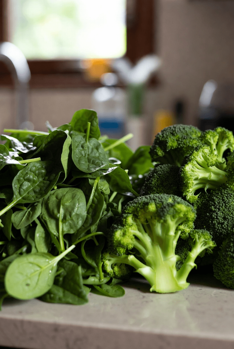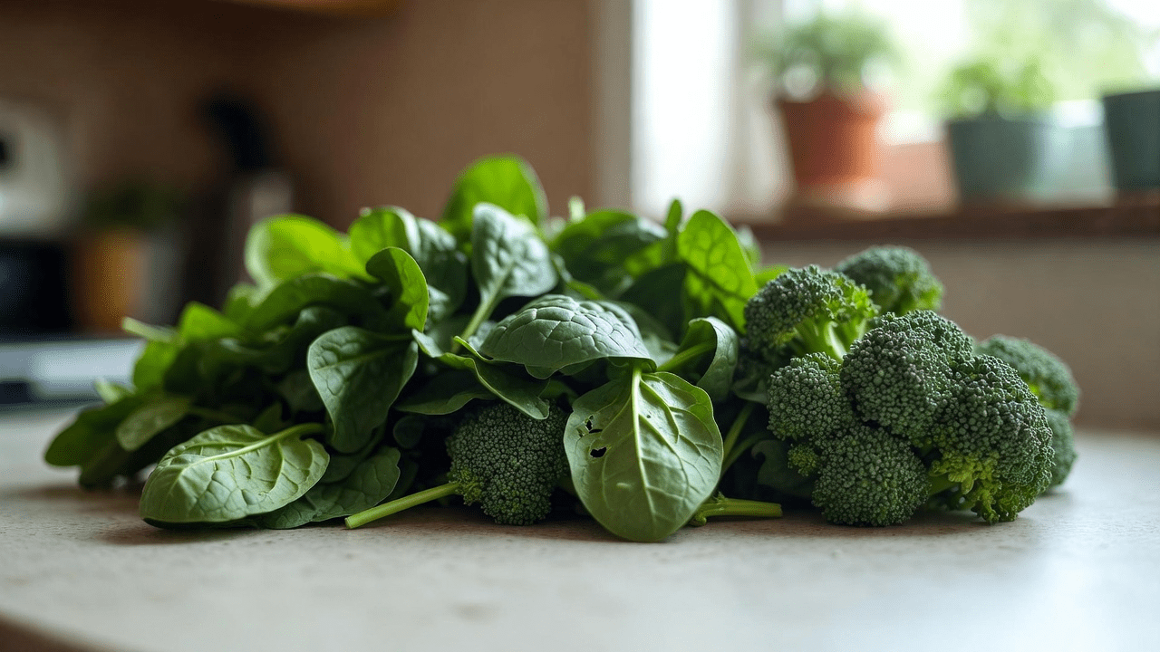 This image captures fresh spinach and broccoli on a kitchen counter, photographed casually with natural window light — easy ingredients to include in salads or stir-fries for antioxidant benefits.