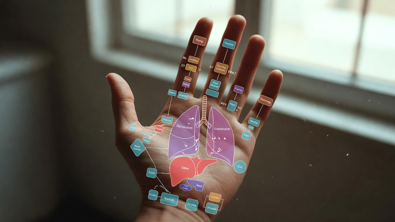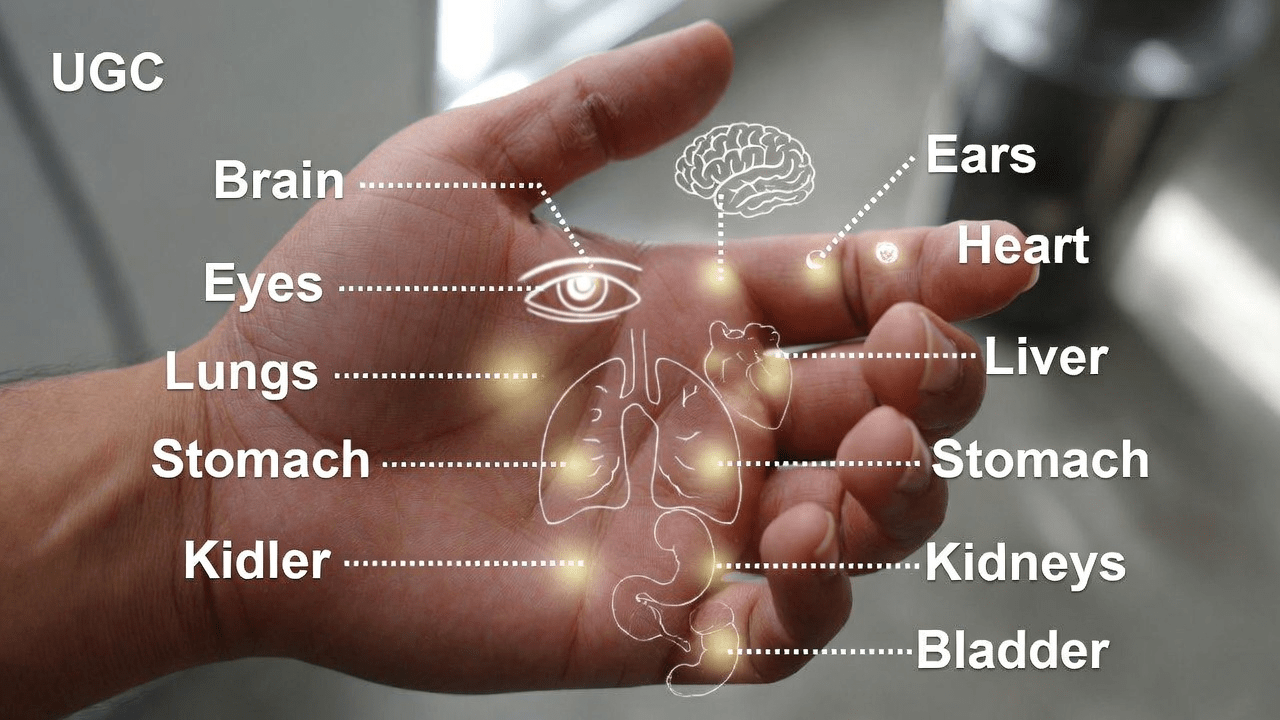 Moving down, the upper palm links to lungs and heart. The center might correspond to stomach and pancreas, and the lower palm to intestines and bladder.