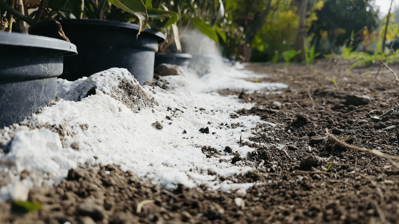 Here, the powder is lightly dusted around the base of potted plants and along a garden bed edge, taken from a low everyday perspective with natural garden textures visible.