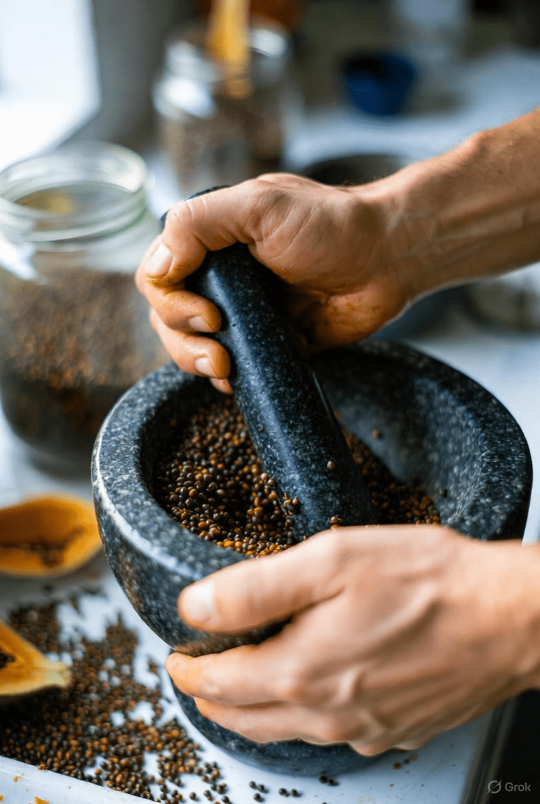 - Grind into powder: Use a mortar and pestle, coffee grinder, or blender to turn dried seeds into a fine powder. Start with 1-2 teaspoons per day.