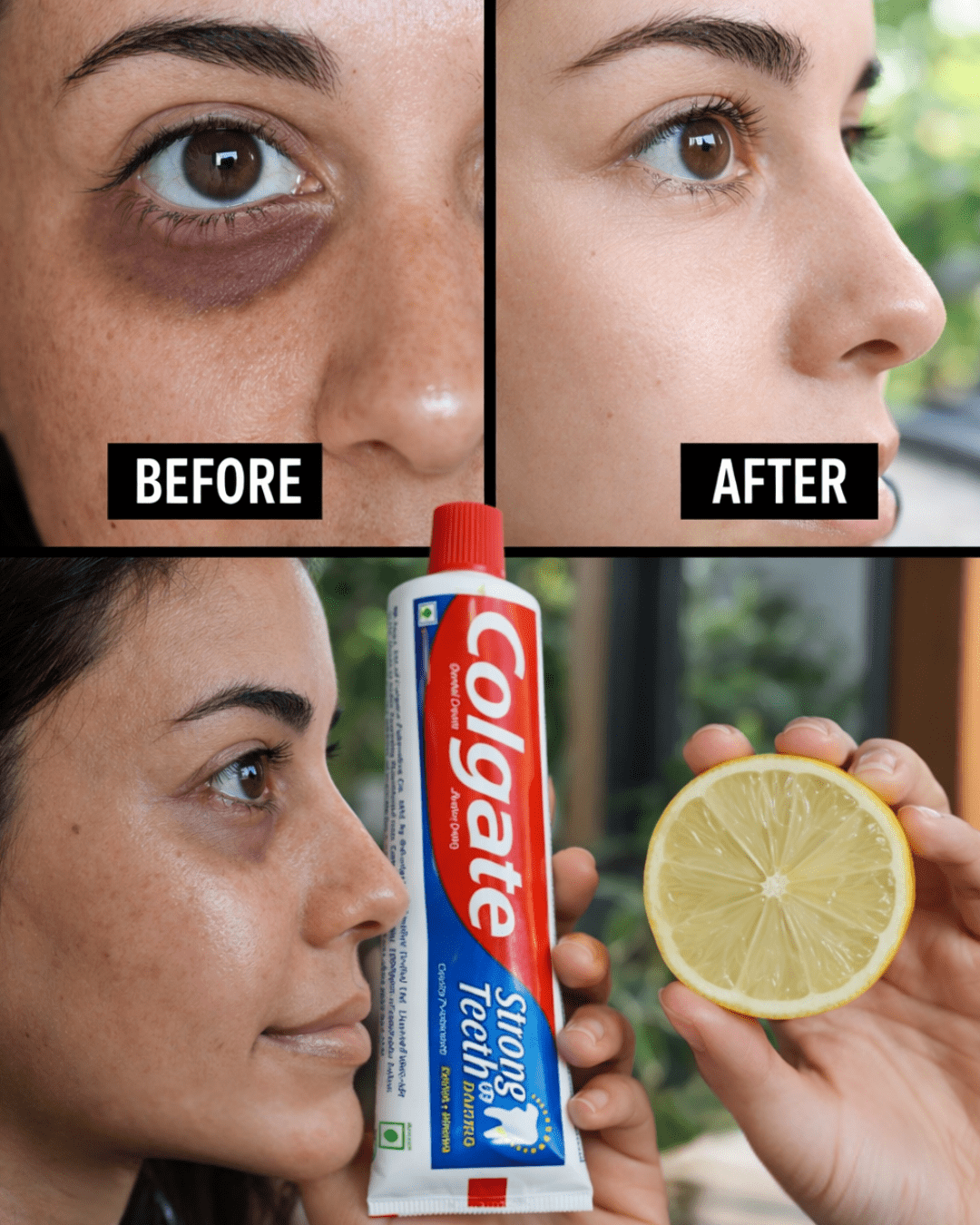 You’ve probably seen those viral images: a person with prominent under-eye darkness applies a paste of toothpaste (often Colgate) and fresh lemon juice, waits a few minutes, then reveals dramatically lighter skin.