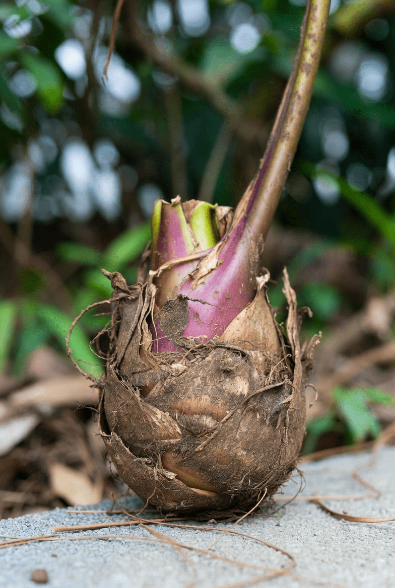 The edible part we’re focusing on is the underground corm, commonly called taro root. It has a brown, hairy exterior and creamy white or purple-speckled flesh inside. When cooked, it offers a mild, nutty flavor and starchy texture similar to potatoes but with unique nutritional qualities.